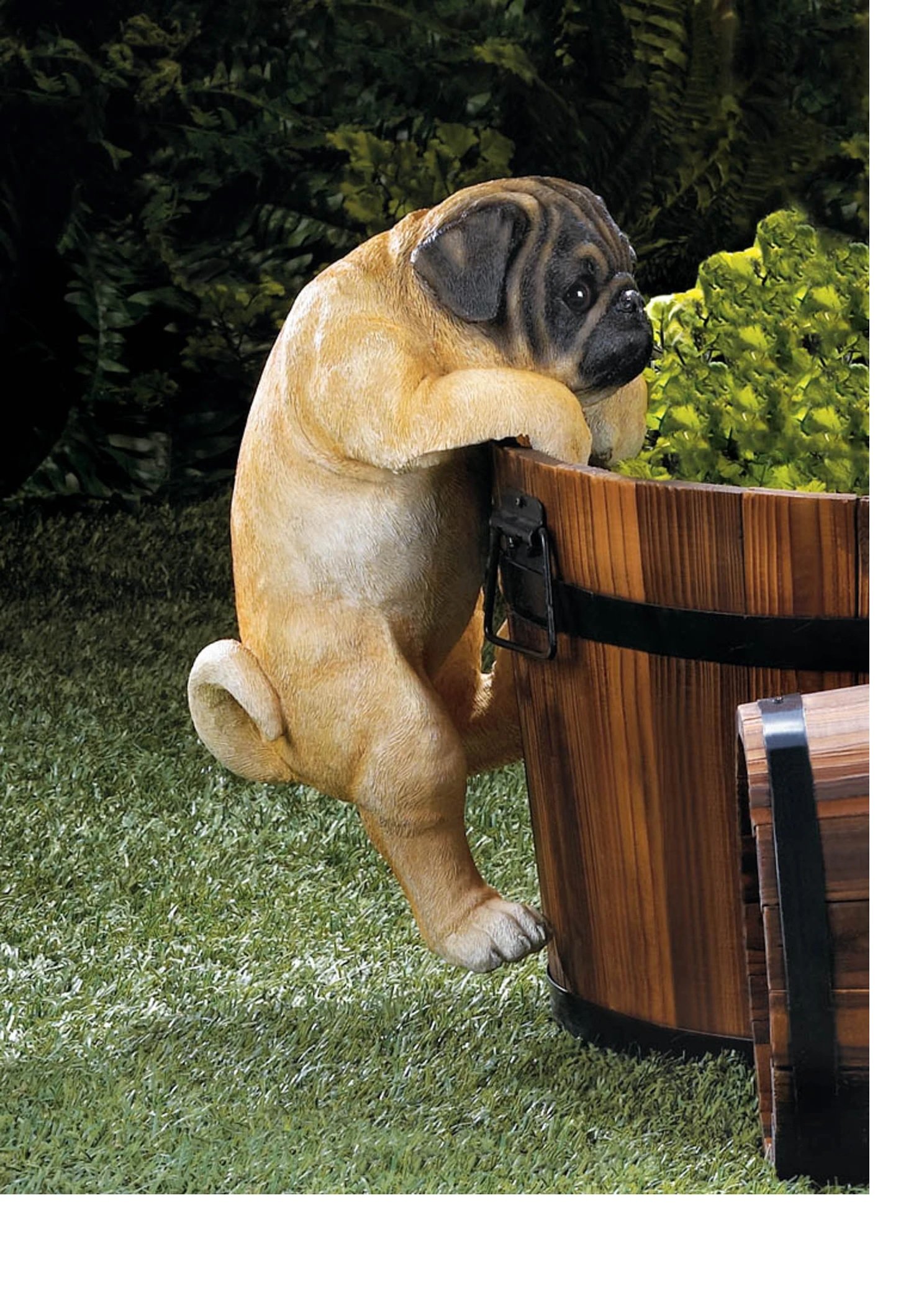 • This mischievous pug named Daisy is climbing with all her might! A charming accent for your favorite potted plant or your fence that will give your space some personality. Can rest on a rail with a width of up to 1.5 inches.