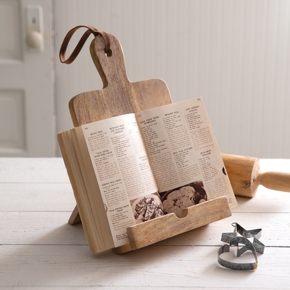 Perfect for holding your families favorite cookbook or tablet, this solid mango wood stand will not only look great in your kitchen but is functional as well. It is made from mango hardwood and has a leather strap through the handle.