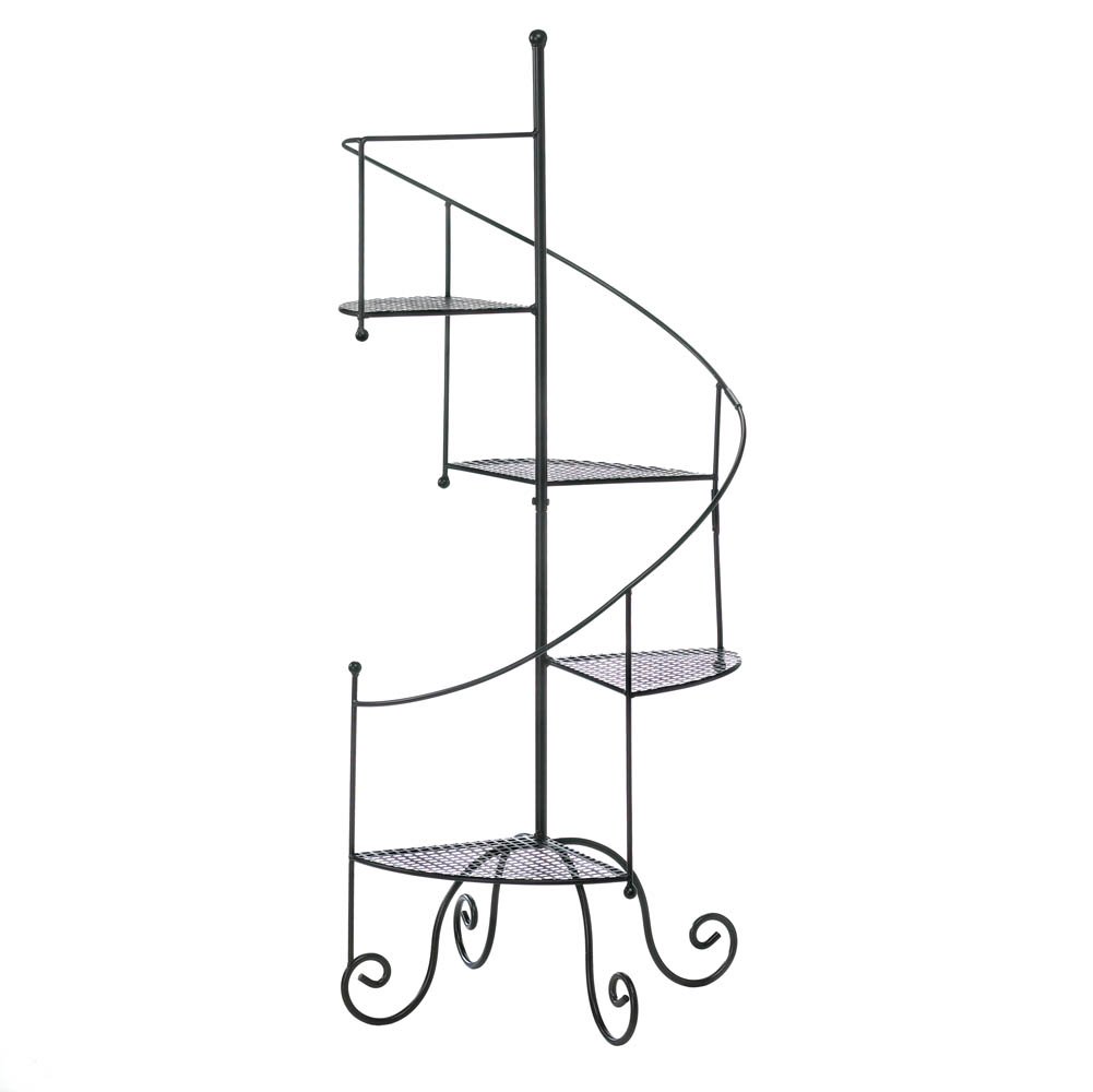 • Give four of your favorite plants a supremely stylish showcase! This metal plant stand features four mesh platforms, a curved 'banister' and four scrolling feet below. Standing at more than three feet tall, it's a grand way to exhibit your green thumb.