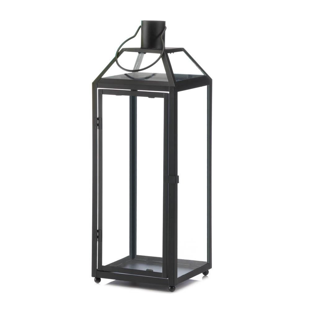 • Take your decor to the height of style with this large black iron candle lantern. Classic lines and clear glass panels make it a surefire way to add timeless chic to your living space. Features top hanging loop and slanted glass roof panels.