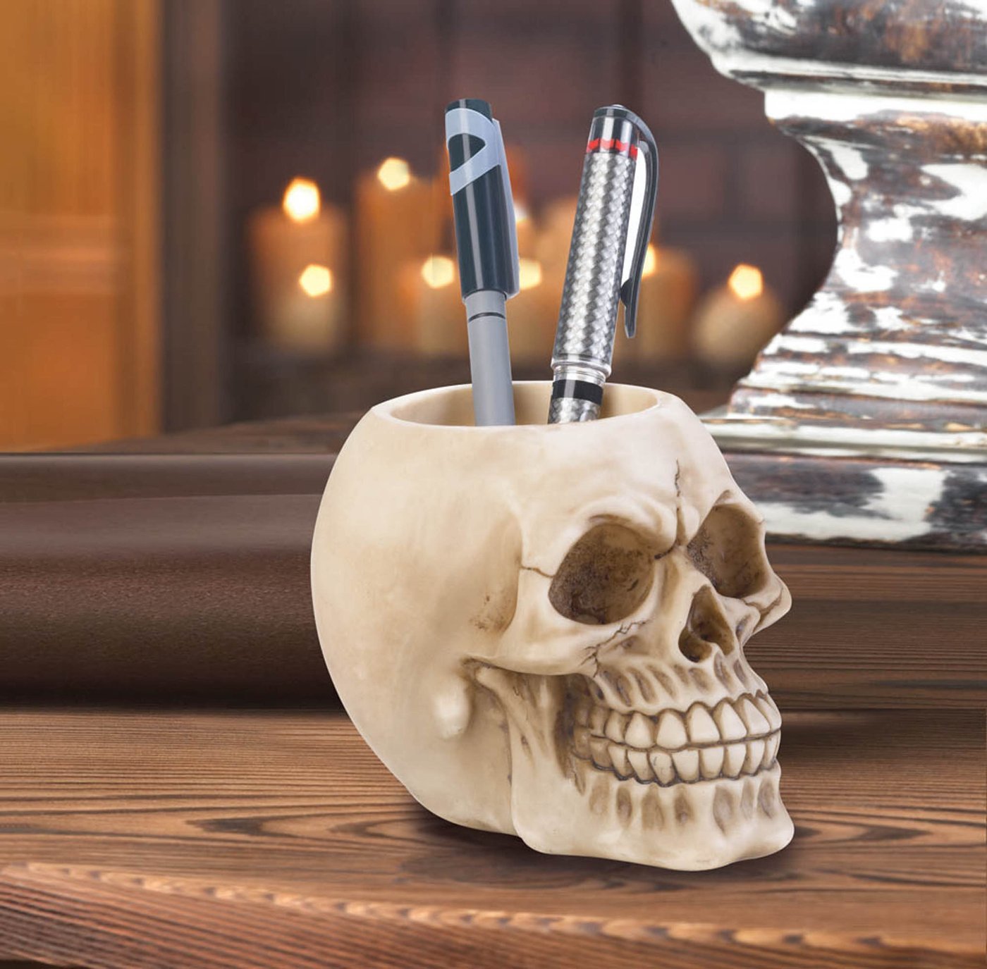 • Spine-chillingly realistic with a grim grin, this skull looks like it was freshly dug up from a graveyard. Decorate your desk with this detailed skull pen holder and it will hold your writing utensils for you while giving you a toothy grin.